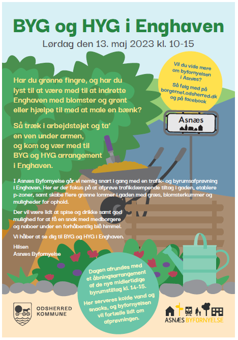 For at markere åbningen af trafik- og byrumsafprøvningen, inviterer Asnæs Byfornyelse til en BYG og HYG dag i Enghaven, lørdag d. 13 maj fra kl 10 – 15. Her er der mulighed for at hjælpe til med den sidste finish på de grønne lommer og byrum, ved at plante, male, skrue mm.